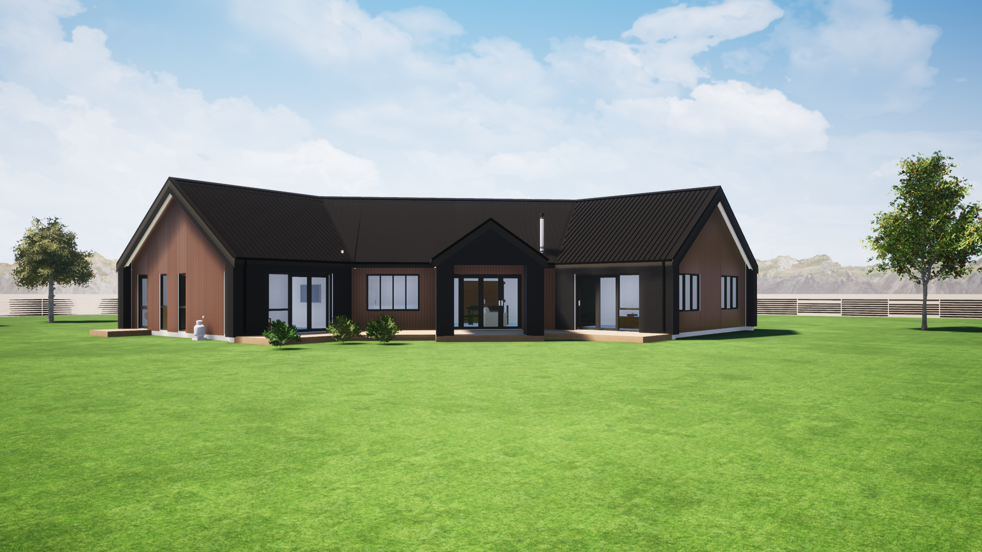 This new build project was for a rural property in North Canterbury, with direct access from the two main bedrooms onto a large outdoor living space. The central covered outdoor living area is accessed directly from the open plan living area. There was no requirement for a garage with this project, as pole sheds would provide adequate storage.